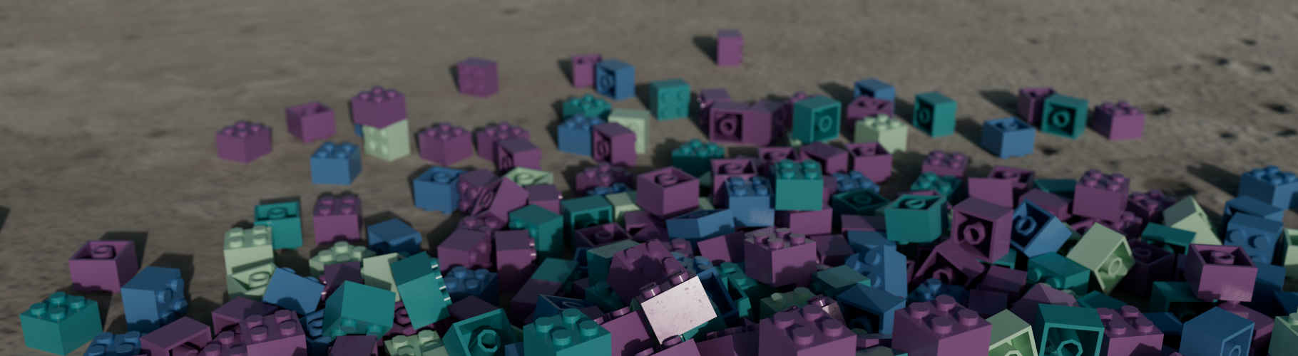 The animation captures the instant when order gives way to disorder, transforming a playful construction into a quiet field of scattered pieces.